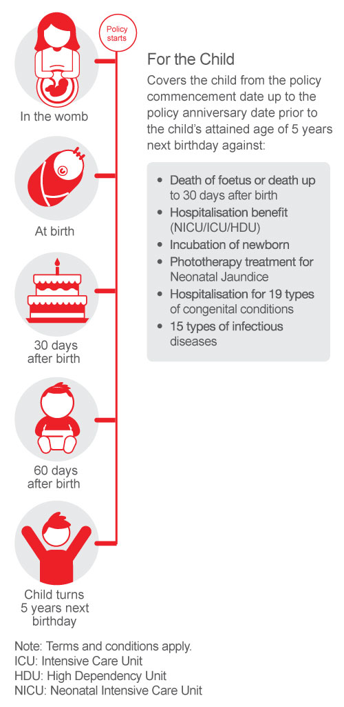 Should death of the child occur during pregnancy, at delivery or up to 30 days after birth, a lump sum of RM5,000 and the total investment value (if any) will be payable to you.