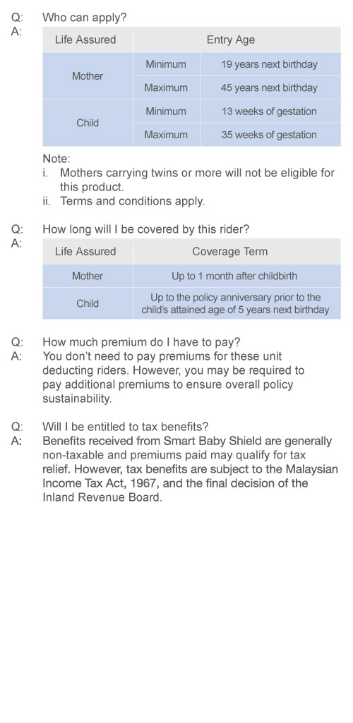 When you add Smart Baby Shield to your SmartProtect Junior, you and your baby can enjoy comprehensive protection while you are still expecting, and even after you deliver your little bundle of joy. Smart Baby Shield provides protection against the unexpected, hospitalisation benefits and additional features to help you both through this crucial period of life. With Smart Baby Shield, you can enjoy complete peace of mind to make this a time to cherish and remember.
