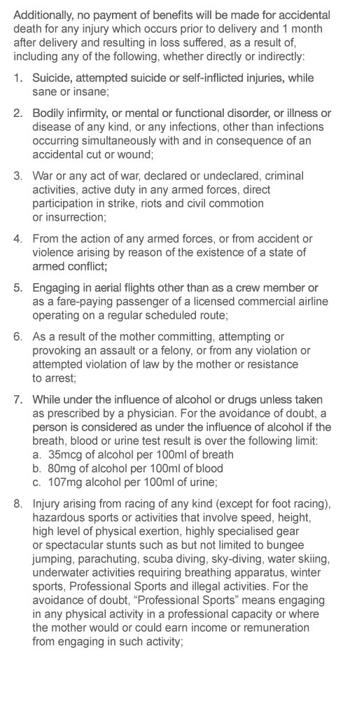 You never know when misfortune may strike and derail your most precious plans. To help secure the future for your loved ones, an accidental death benefit will be payable upon the death of the mother prior to delivery and up to 1 month after delivery.